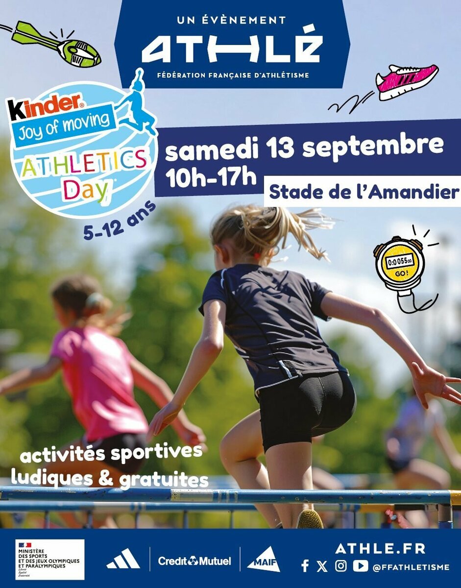 Samedi 13/09, rendez-vous au stade de l'Amandier pour une journée découvertes des disciplines de l'athlétisme. Au programme sprint, sauts, lancers...Prévoir 1 h00 pour faire le tour des ateliers. Remise d'une médaille à chacun + gouter. Nous vous y attendons nombreux!!