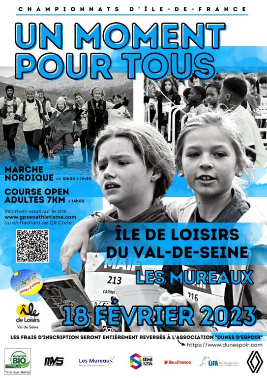 Courses OPEN organisée en amont des championnats IDF de cross. Pour les jeunes (eveil à benjamins) et adultes. Tous les droit d'inscriptions (2 euros pour les enfants et 5 euros pour les adultes sont reversés à l'ASSOCIATION DUNES D'ESPOIR